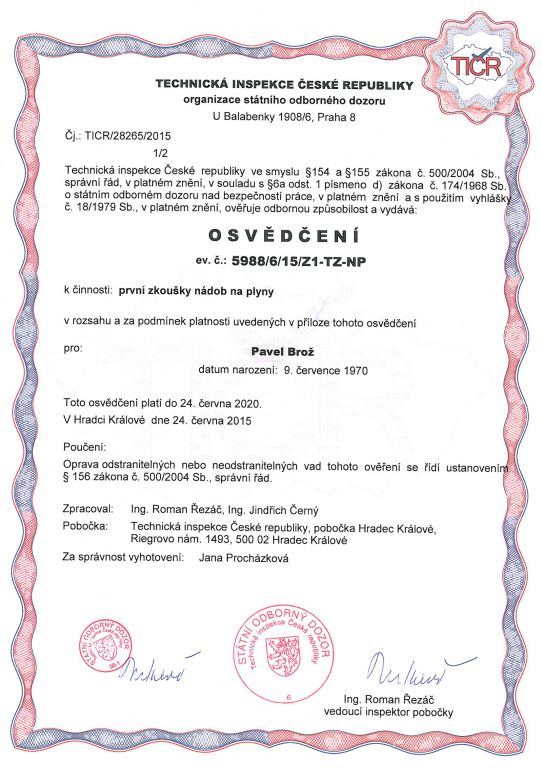 - provádění revizí a zkoušek tlakových zařízení v rozsahu: periodické zkoušky nádob k dopravě plynů